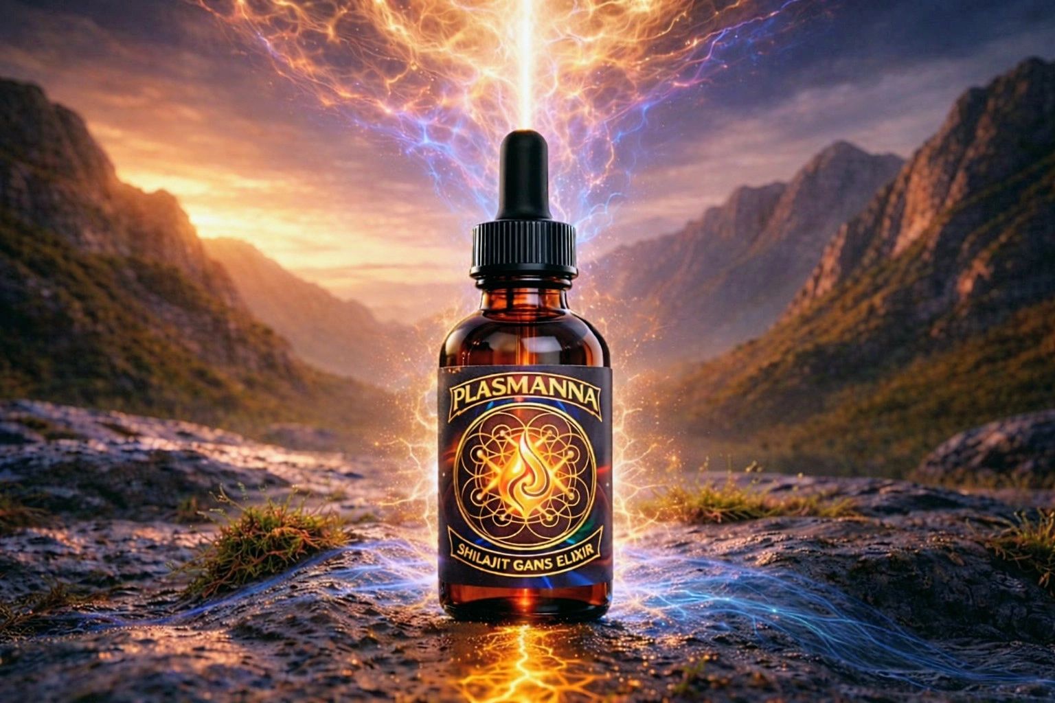 Plasmanna Shilajit GANS Elixir is a liquid tincture of authentic Rocky Mountain shilajit, sourced from wild high-altitude deposits in the San Luis Valley of Colorado, processed through three GANS structured waters, Silver, Copper, and Gold, within a coherent plasma field environment sustained by the Plasmanna Personal Plasma Harmonizer.